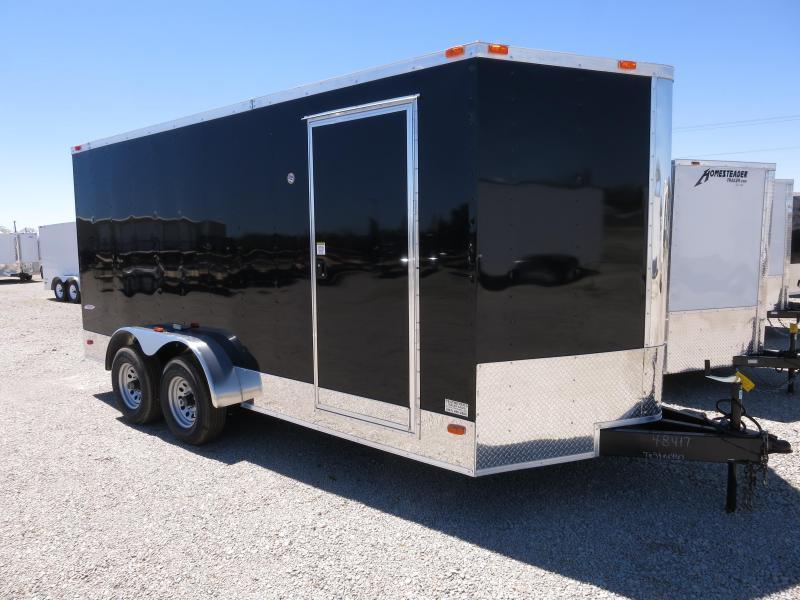The Freedom Trailer is 7x16 Tandem Axle trailer has a 32" RV door with flush look, dome light, with switch at side door, Electric brakes, 12" extra height, roof vent, radial tires, dexter axles, cast corners, polished aluminum on sides at the bottom, polished nose, LED lights, gray wheels, Color matched screws, 16 on center cross members, 3/4 plywood floor, 3/8 plywood wall, stone guard, 6' I-beam, and rear ramp door. The trailer is black in color with 7,000 GVW.
