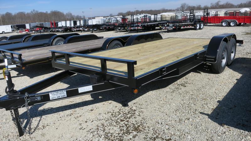 The 82x18 P&T Tandem Axle Wood Floor Car Hauler has treated wood floor, 1 brake axle, 5" channel frame, ramps, dove tail, LED Lights, and Silver Mod Wheels. The trailer as 10,000 GVW and is Black in color.