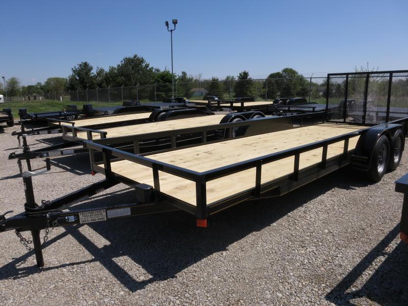 The 77x20 P&T Tandem Axle Utility Trailer has treated wood floor, 1 brake axle, rear fold down gate and Silver Mod Wheels. The trailer as 7,000 GVW and is black in color.