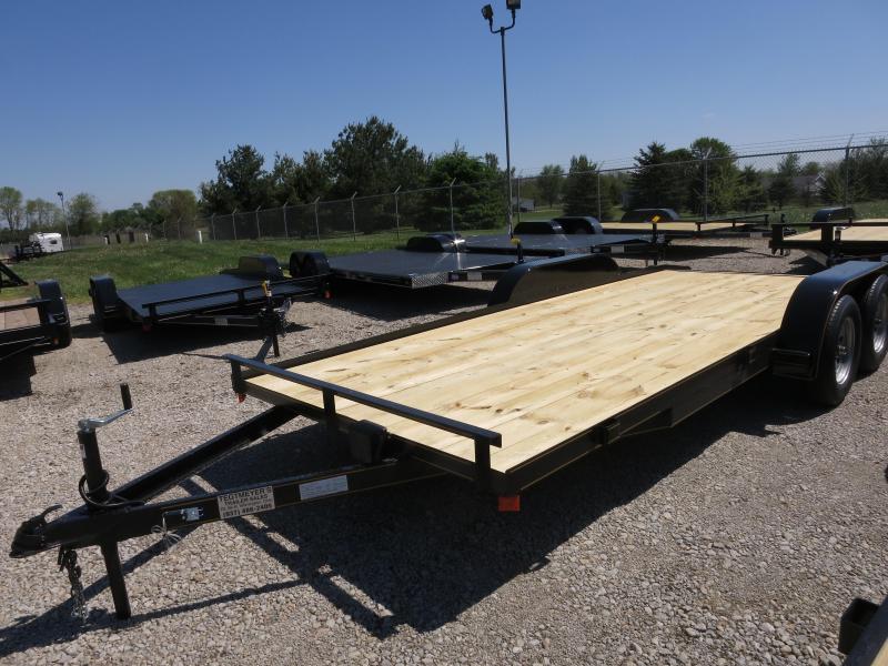 The 82x18 P&T Tandem Axle Wood Floor Car Hauler has treated wood floor, 1 brake axle, ramps, dove tail, and Silver Mod Wheels. The trailer as 7,000 GVW and is black in color.