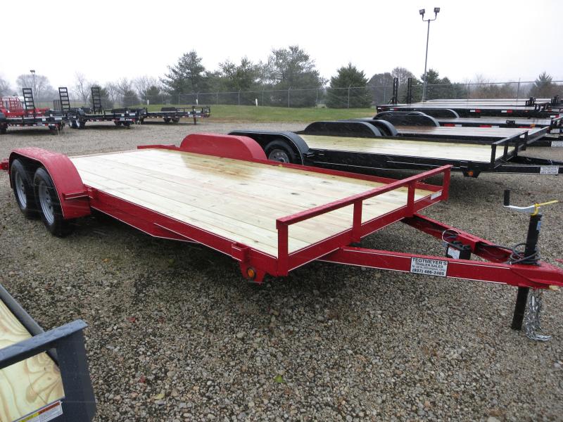 The 82x18 Lone Wolf Tandem Axle Wood Floor Car Hauler has treated wood floor, Wrap Tongue, 1 brake axle, 5' ramps with storage, 2' dove tail, and Silver Mod Wheels. The trailer as 7,000 GVW and is red in color.