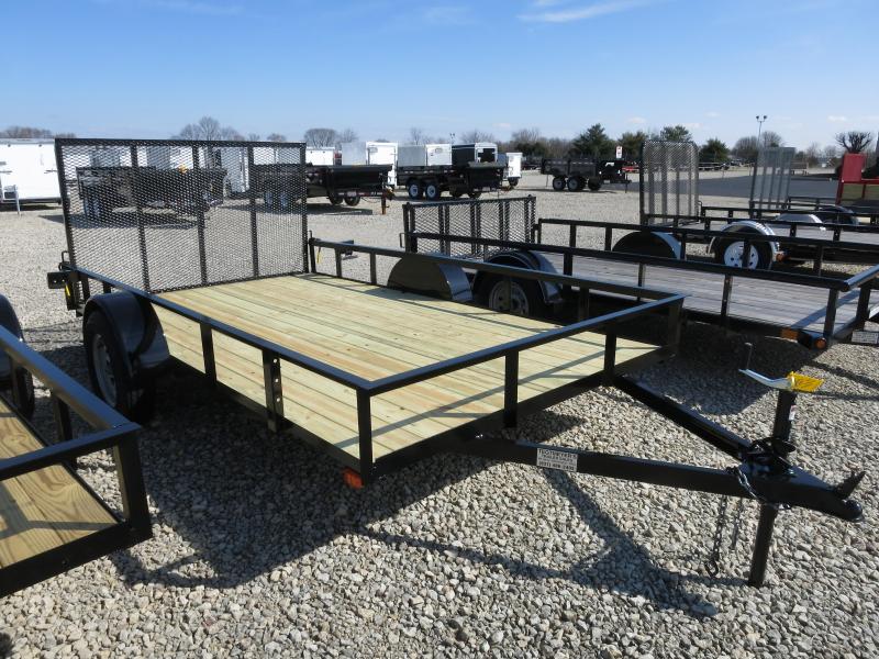 The 7X12 American Manufacturing Single Axle Wood Floor Utlity Trailer has treated wood floor, 15" Tires, extra wide, and rear gate. The trailer as 2,990 GVW and is black in color.
