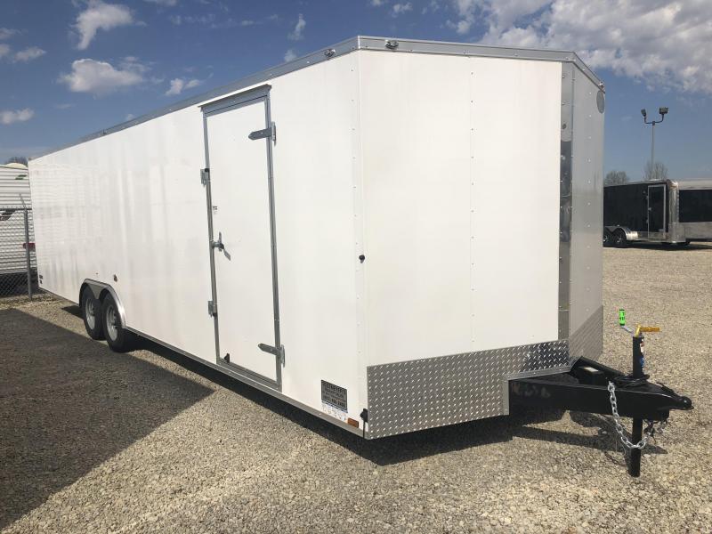 The Continental Cargo 8.5x28 Tandem axle enclosed trailer is WHITE in color with rear ramp door, Side door, (1) 12V Dome Light (Total of 2) with (1) Wall Switch, LED Tail Lights, roof vent, extended tongue, flush lock side door, radial tires, 4 drings and 24" Aluminum Tread Plate Stoneguard (ATP). The GVW is 10,000 lbs.