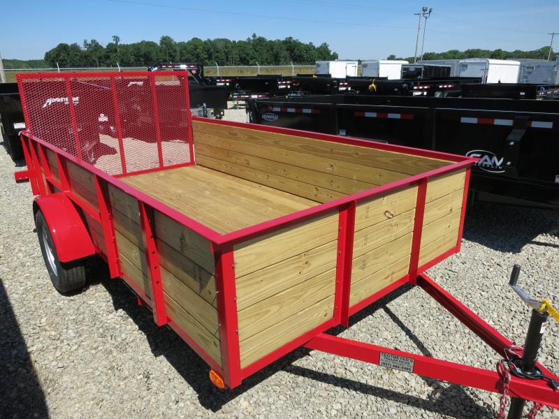 The 6x12 American Manufacturing Single Wood Floor Utlity Trailer has treated wood floor, high wood sides, and pinless rear gate. The trailer as 2,990 GVW and is red in color.