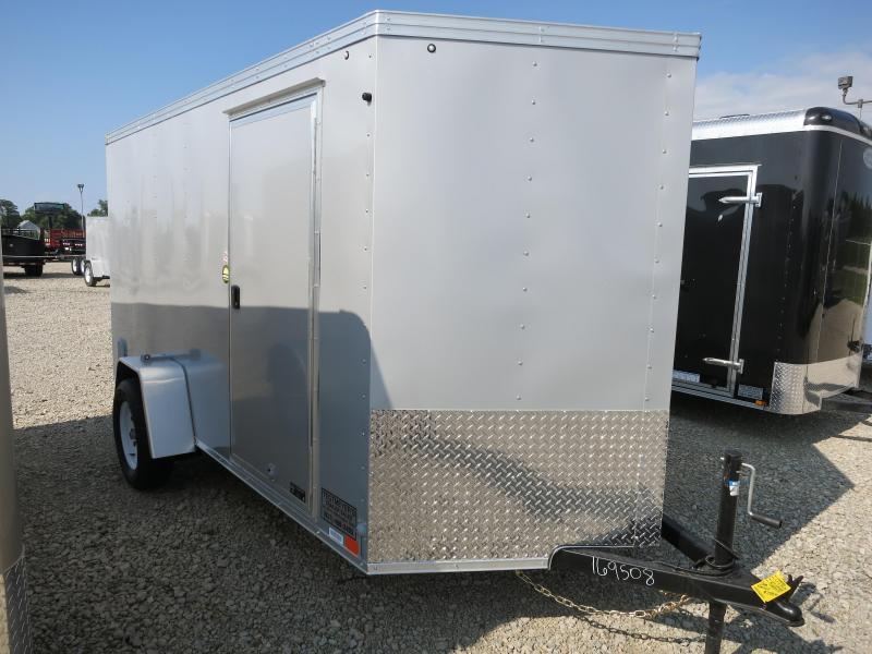 The United Expressline XLV model 6x12 single axle enclosed trailer is silver in color with rear ramp door, v-nose, and 15" wheels. The GVW is 2,990 lbs.