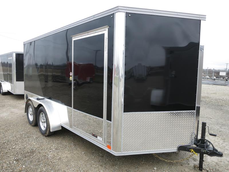 United 7x14 Tandem Axle Enclosed Trailer is a XLMTV Motorcycle trailer and is black and charcoal in color. The trailer is loaded with accessories and set up ready to haul your motorcycle. This motorcycle trailer has RV side door with flushlock, Aluminum wheels, d rings, wheel chocks, white interior walls, white ceiling, polished corners, screwless smooth exterior sides, 6' interior height, rear ramp door and 28" V-nose.