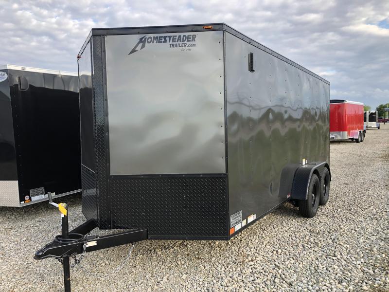 The Homesteader 7x16 Enclosed Blackout Trailer has 7000 gvw, rear ramp door, 4 drings in the floor, stoneguard, side door and side wall vents.