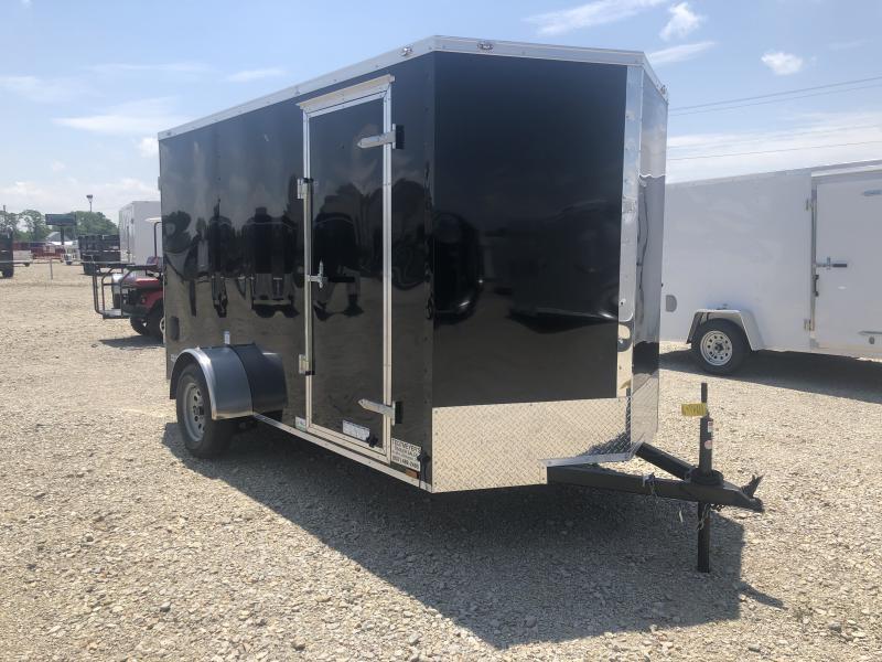 The Continental Cargo 6X12 single axle enclosed trailer is black in color with rear ramp door, (2) 12 Volt Dome Light with (1) Wall Switch at side door, LED Tail Lights, stablizer jacks at rear, 16" Aluminum Tread Plate Stoneguard (ATP).