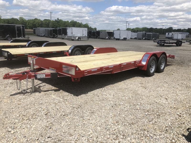 The 82x18 Heartland Tandem Axle Car Hauler has treated wood floor, 1 brake axle, Ramps out the rear, powder coat paint, and Silver Mod Wheels. The trailer as 7,000 GVW and is red in color.