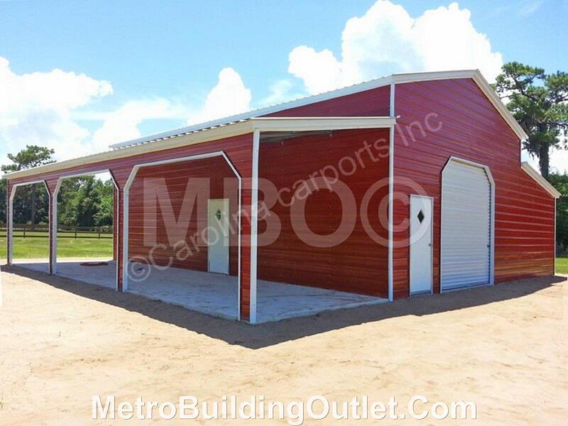 48X40 BARN / GARAGE #B149, VERTICAL ROOF, 24X40X14 RAISED CENTER BAY GARAGE, (2)12X40X10 LEAN-TO'S, (1)10X10 GARAGE DOOR, (2)36X80 WALK IN DOORS.
