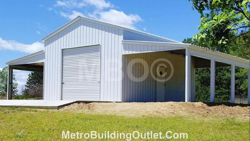 44X30 BARN / GARAGE #B203, VERTICAL ROOF, 20X30X12 RAISED CENTER BAY GARAGE, (2)12X30X8 LEAN-TO'S, (1)10X10 GARAGE DOOR, (2)36X80 WALK IN DOORS.