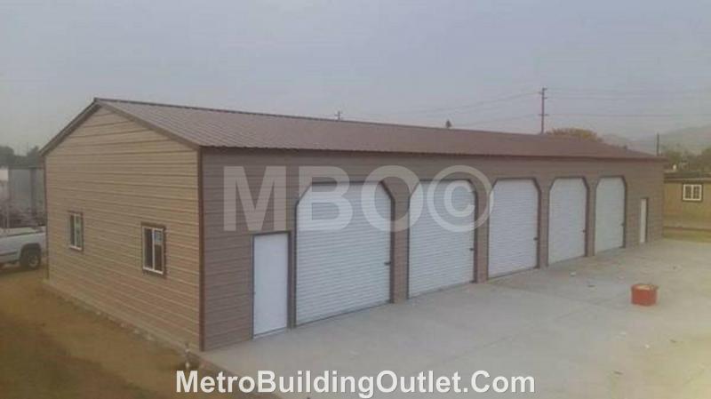 30X80X12 GARAGE / SHOP #G113, VERTICAL STYLE ROOF, HORIZONTAL SIDES, FULLY ENCLOSED, (2)WALK IN DOORS, (5)10X10 GARAGE DOORS, (4)WINDOWS