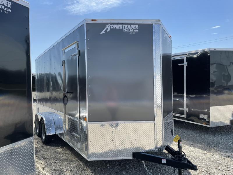The Homesteader 7x16 Enclosed Trailer is charcoal gray in color. The trailer has 7000 gvw, rear ramp door, stoneguard, 1 Foot extra height, 030 metal, aluminum treadplate, OHV Package, D rings, side wall vents and side door. The trailer is a Intrepid model.