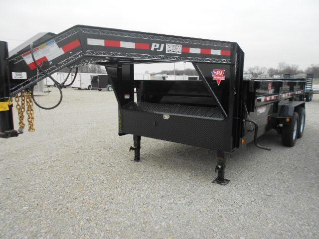 PJ Trailers 83x16 Gooseneck Tandem Axle Dump Trailer is black in color. The paint is powder coated. The trailer has 2 - 7,000 lb axles. This trailer has the combo gate, Dual Jacks, Tarp kit, scissor lift and ramps.