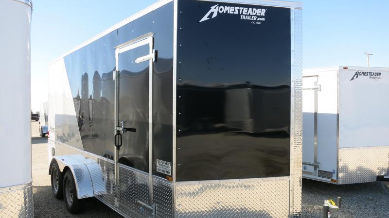 The Homesteader 7x16 Enclosed Trailer is black and silver in color. The trailer has 7000 gvw, rear ramp door, stoneguard, 1 Foot extra height, 030 metal, aluminum treadplate, OHV Package, D rings, 16" on center walls, side wall vents and side door. The trailer is a Intrepid model.