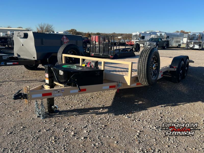 NEW 2025 BCL Fabrication 20' Power Tilt Bumper Pull Trailer, Adjustable 2 5/16" Coupler, 10K Square Jack, 7000# Axles, Removable Fenders, Aluminum Rims, 235/80R16 Tires, Battery Included, On Board Charger, Sealed Wire Harness, LED Lights, Pierce Winch, Tongue Mounted Locking Tool Box, Double Acting Hydraulic Cylinder, Pooch Decking, Rub Rail with Stake Pockets, Desert Tan.