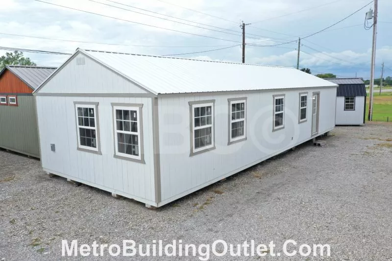 40YR. METAL ROOF, 5:12 ROOF PITCH, 7/16" OSB ROOF DECKING, 50YR. LP SMARTSIDE EXTERIOR SIDING & TRIM, STAINED EXTERIOR, 7'9" SIDE WALL HEIGHT, PREMIUM 2"X4" STUD WALLS 16" ON CENTER, DOUBLE STUDDED EVERY 4', DOUBLE HEADER PLATE (2"X4" PLUS 2"X8" TOP PLATE), (4) 4"X6" PRESSURE TREATED SKIDS, PREMIUM 2"X8" FLOOR JOISTS 16" ON CENTER, PREMIUM 3/4" PLYWOOD FLOOR DECKING, (1) WALK IN DOORS (STD. 36"X80"), (8) 3'X4' DOUBLE PANE INSULATED WINDOWS, (1) 3'X3' DOUBLE PANE INSULATED WINDOW, RADIANT BARRIER, VAPOR BARRIER, INSULATED ROOF, INSULATED WALLS, 65' OF INTERIOR STUD WALLS, LP SMARTSIDE INTERIOR WALLS, LP SMARTSIDE PANELED CEILING, DELUXE ELECTRICAL PACKAGE, BATHROOM PACKAGE, KITCHEN PACKAGE, VINYL FLOOR.