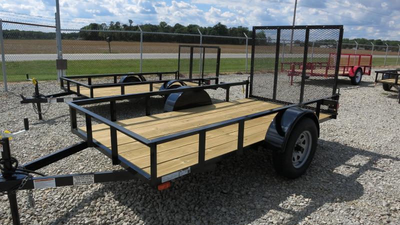 The 5X10 American Manufacturing Single Axle Wood Floor Utlity Trailer has treated wood floor and pinless rear gate. The trailer as 2,990 GVW and is black in color.