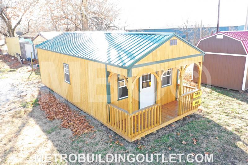 14X32 UTILITY CABIN WITH 4' FRONT PORCH FRAMED IN 2X4S AND BEAUTIFUL URETHANE WOOD GRAIN STAIN ON WATERPROOF LOUISIANA PACIFIC SMARTSIDE.