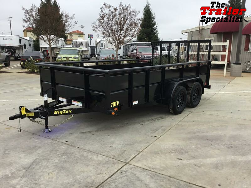 New 2018 Big Tex 70TV-14-6W, 6 x 14 ft tandem axle landscape utility trailer. 7000 lb GVWR, 1755 lb empty weight and a 5245 lb carrying capacity, 6' wide, sides are 16 Gauge 24" V-crimped steel for extra strength, with a 2-3/8" top pipe rail for a total height of 29-3/8" high. Includes 4 inside tie down loops, LED lights for maximum safety and brightness, two 3500 lb EZ lube axles with brakes on 1 axle and a 4 ft rampgate. Perfect for lawn and garden use! Call for more information. Financing available!