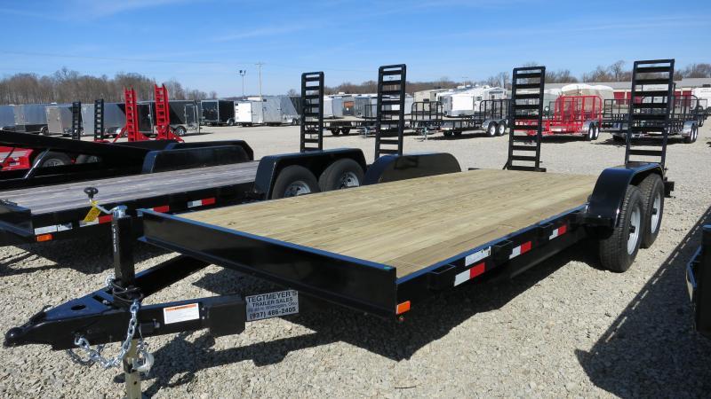 The 82x20 American Manufacturing Tandem Axle Wood Floor Flatbed trailer has treated wood floor, 1 brake axle, 2' dove, and stand up ramps. The trailer as 9,990 GVW and is black in color.