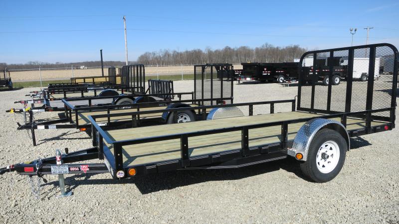 The 7x14 PJ Single Axle Utility Trailer has treated wood floor, Aluminum Treadplate fenders, rear ramp gate, and powder coat paint. The trailer as 2,990 GVW and is black in color.