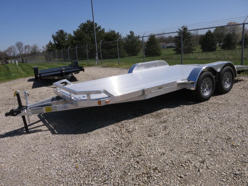 The Continental Cargo 7X18 Tandem axle All Aluminum Open Car trailer has 3' Beavertail, Fold-Down Stabilizer Jacks, (4) 5,000 lb. D-Rings, Tandem Removable Fenders, Removable Rear Ramps, Chrome Lug Nuts, Chrome Center Caps, and aluminum plank floor. The GVW is 7,000 lbs.