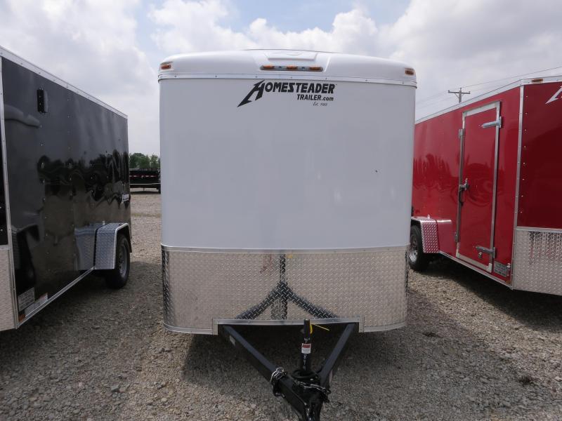 The Homesteader 6x12 Single Axle is a Challenger Model. The trailer has a 32'; side door, sidewall flow thru vents, stone guard, and rear ramp door. The trailer is white in color with 2,990 GVW.