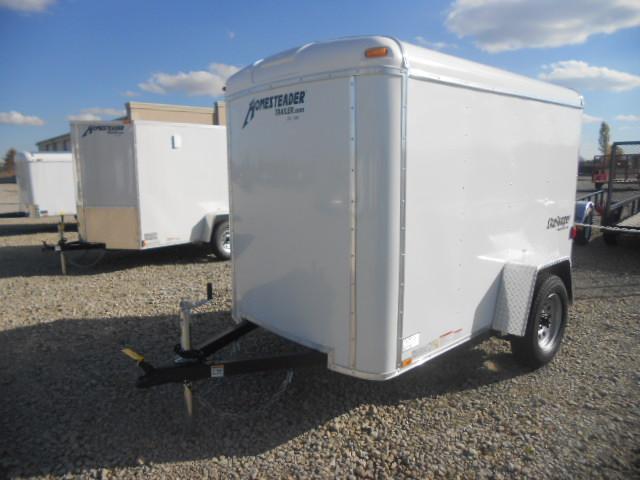 Homesteader 5x8 Single Axle Enclosed is white in color. The trailer has a single rear door and 2990 GVW. The Trailer is a Challenger model.