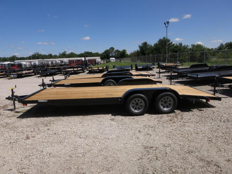 The 82x20 American Manufacturing Tandem Axle Wood Floor Car Hauler has treated wood floor, 1 brake axle, extra wide, dove, removable fenders, and Slide in ramps. The trailer as 7,000 GVW and is black in color.
