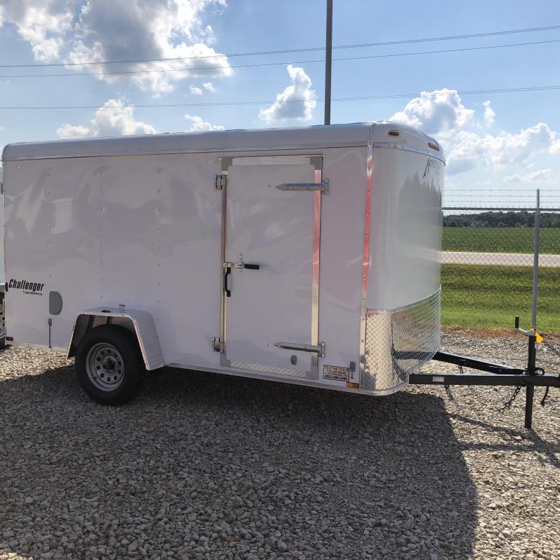 The Homesteader 5x8 Single Axle is a Challenger Model. The trailer has a 32'; side door, sidewall flow thru vents, stone guard, and rear ramp door. The trailer is white in color with 2,990 GVW.