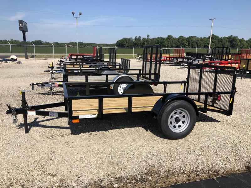 The 5X10 American Manufacturing Single Axle Wood Floor Utlity Trailer has treated wood floor, 15' tires and wheels, 2' dove, and 3' rear pinless gate. The trailer as 2,200 GVW and is black in color.