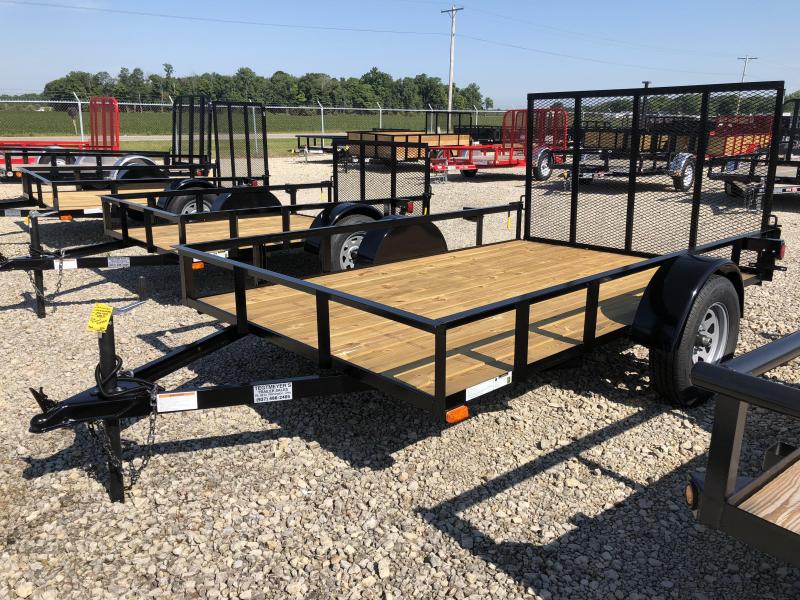 The 6X10 American Manufacturing Single Axle Wood Floor Utlity Trailer has treated wood floor, 15" tires and pinless rear gate. The trailer as 2,990 GVW and is black in color.