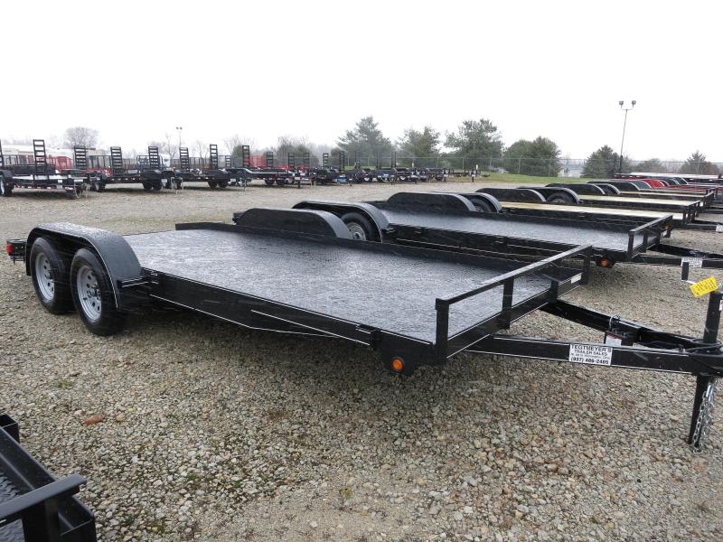 The 82x18 Lone Wolf Tandem Axle Steel Floor Car Hauler has 1 brake axle, 5' ramps with storage, dove tail, and Silver Mod Wheels. The trailer as 7,000 GVW and is Black in color.