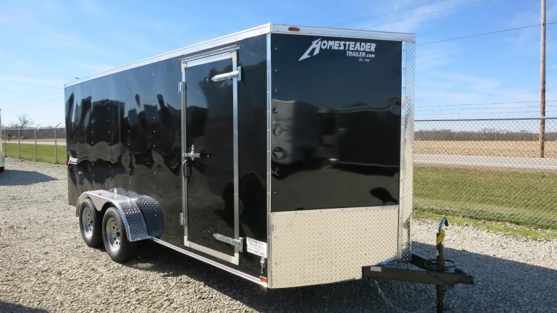 The Homesteader 7x16 Enclosed Trailer is black in color. The trailer has 7000 gvw, rear ramp door, 4 drings in the floor, stoneguard, side door and side wall vents.