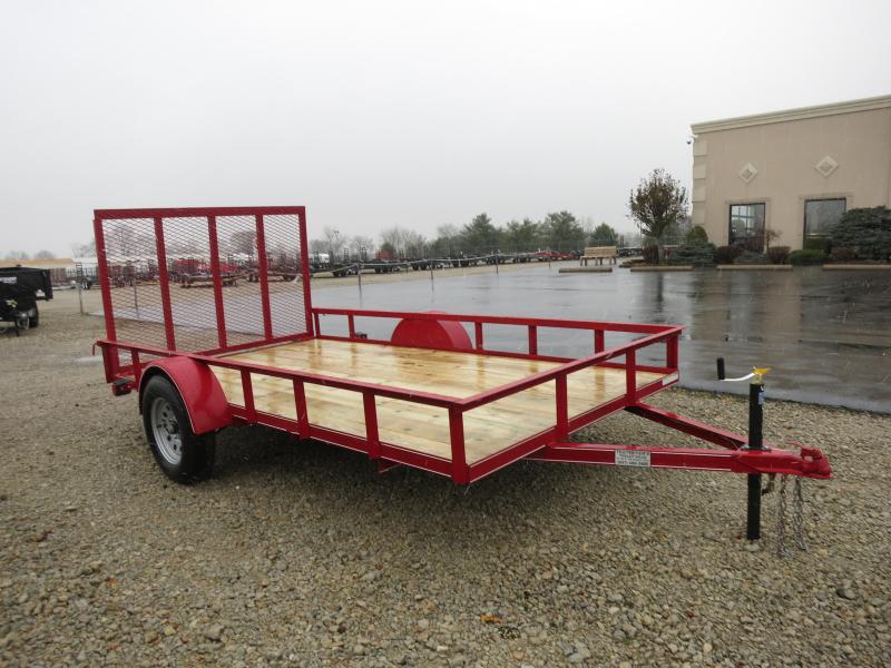 The 6x12 P&T Single Axle Utility Trailer has treated wood floor, rear fold down or in gate, and Silver Mod Wheels. The trailer as 2,990 GVW and is red in color.