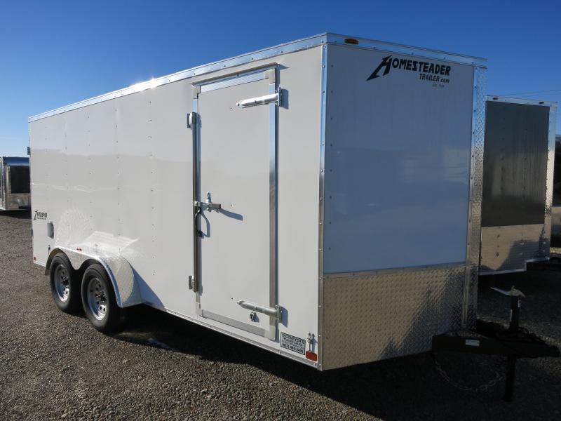 The Homesteader 7x16 Enclosed Trailer is white in color. The trailer has 7000 gvw, double rear doors, stoneguard, and side door. The trailer is a Intrepid (formerly Patriot model).
