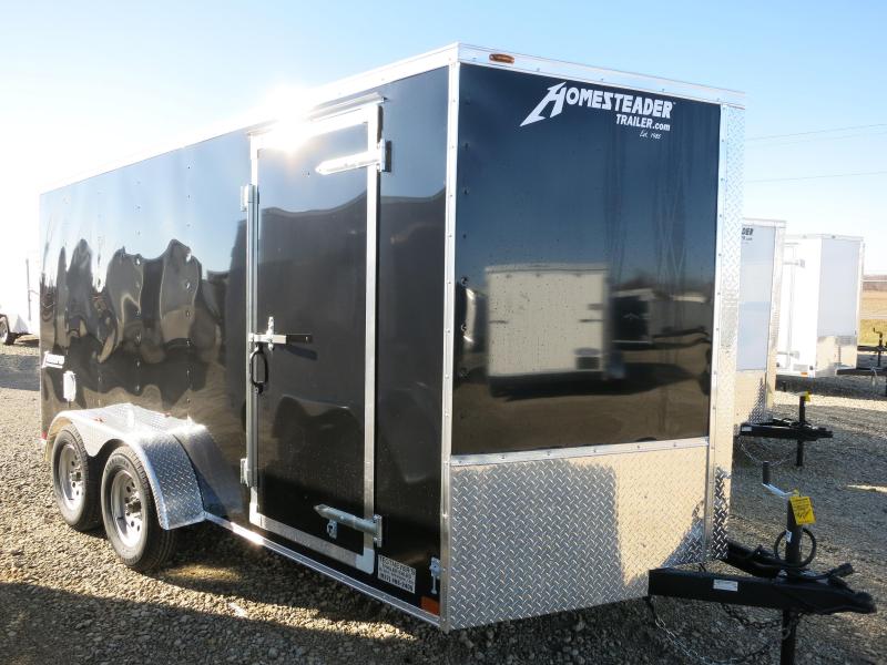 The Homesteader 7x14 Enclosed Trailer is black in color. The trailer has 7000 gvw, rear ramp door, stoneguard, side wall vents and side door. The trailer is a Intrepid (formerly Patriot) model.