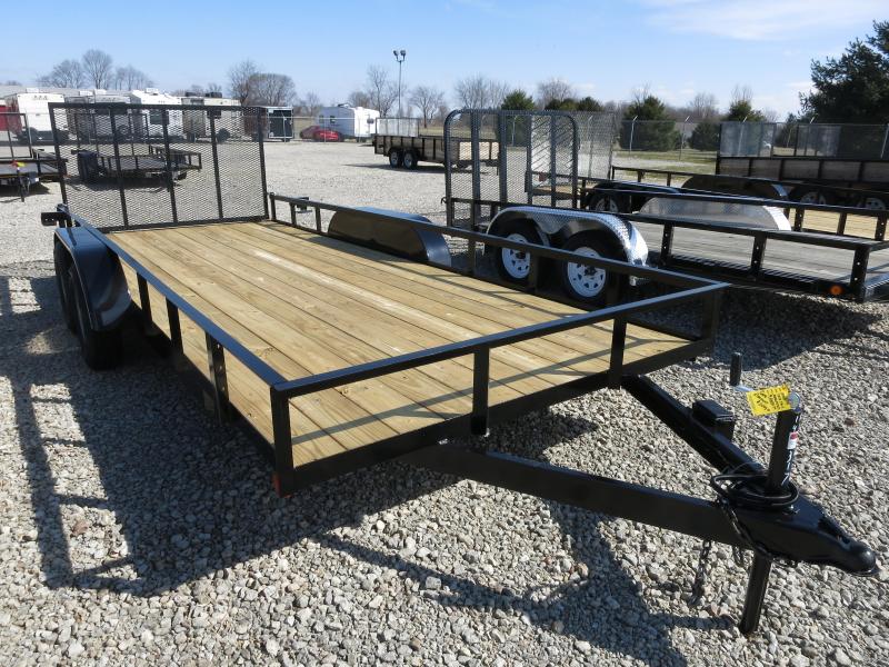 The 7x18 American Manufacturing Tandem Axle Wood Floor Utility Trailer has treated wood floor, 1 brake, wrap tongue, extra wide, and rear gate. The trailer as 7,000 GVW and is black in color.