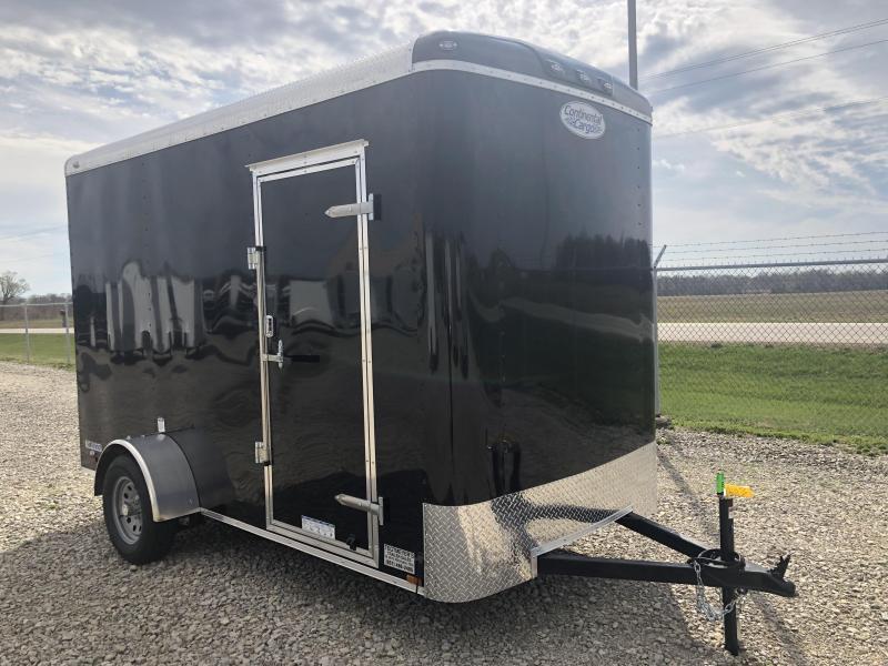 The Continental Cargo 6X12 single axle enclosed trailer is black in color with rear ramp door, roof vent,12" extra height, radial tires, and 32" Side door. The GVW is 2,990 lbs. This is a Tailwind model.