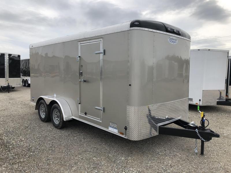 The Continental Cargo 7x16 Tandem axle enclosed trailer is beige in color with rear ramp door, radial tires, roof vent, and side door. The GVW is 7,000 lbs. This is a Tail Wind model.
