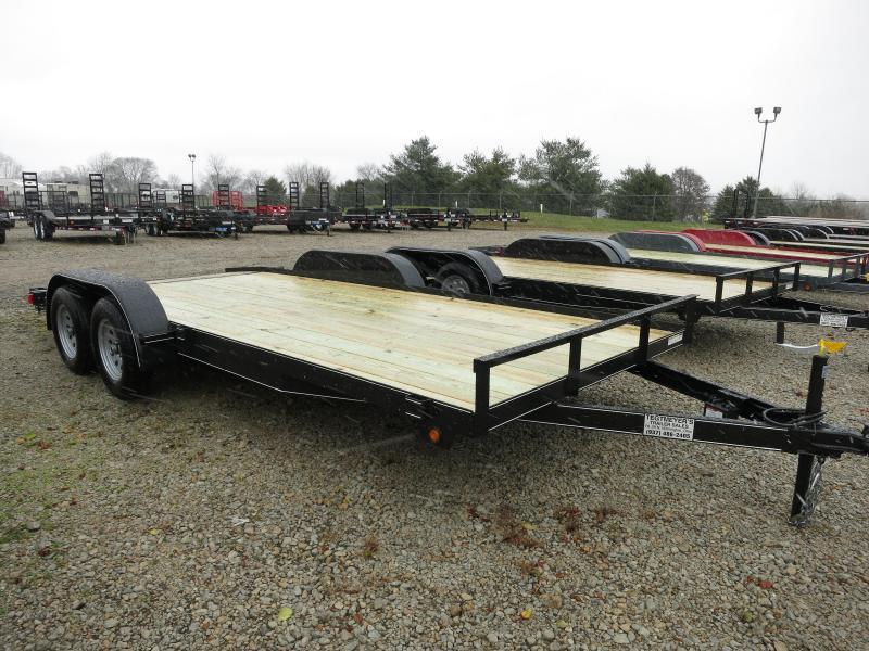 The 82x20 Lone Wolf Tandem Axle Wood Floor Car Hauler has treated wood floor, Wrap Tongue, 1 brake axle, 5' ramps with storage, 2' dove tail, and Silver Mod Wheels with radial tires. The trailer as 7,000 GVW and is black in color.