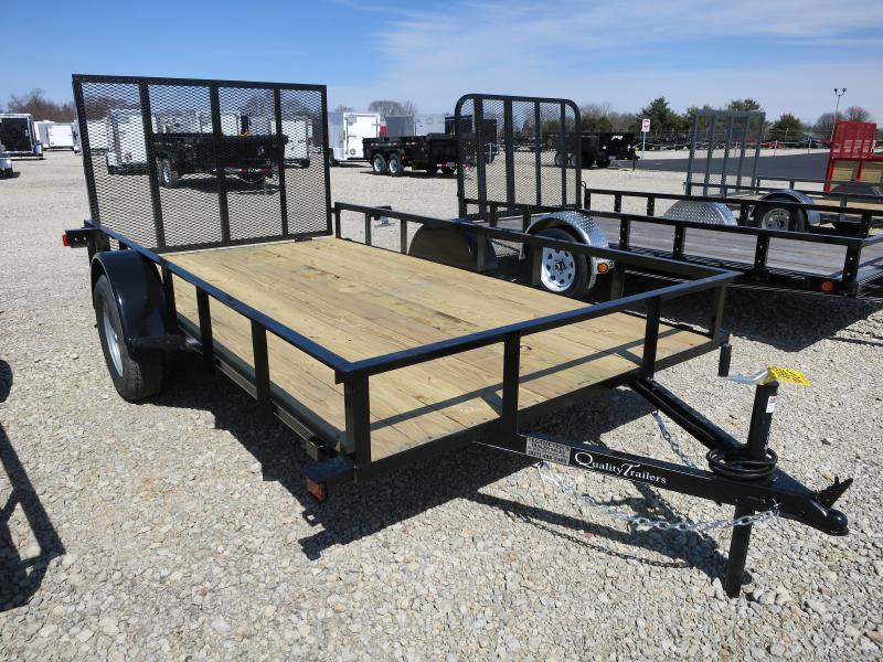 The 6x12 Quality Trailer Single Axle Wood utility trailer has treated wood floor, rear gate, and Silver Mod Wheels with ST205/75 R15 6 ply Radial tires. The trailer as 2,990 GVW and is black in color.