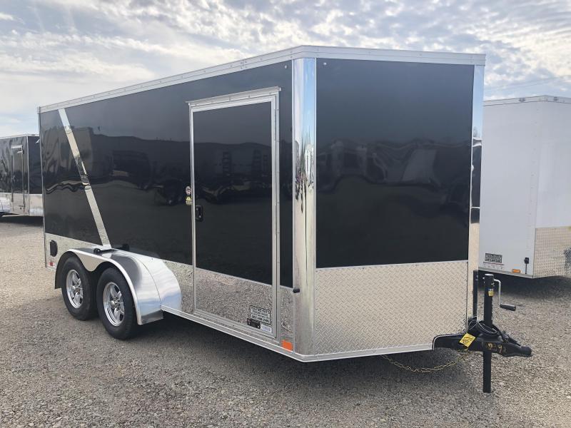 United 7x14 Tandem Axle Enclosed Trailer is a XLMTV Motorcycle trailer and is black and silver in color. The trailer is loaded with accessories and set up ready to haul your motorcycle. This motorcycle trailer has RV side door with flushlock, Aluminum wheels, d rings, wheel chocks, white interior walls, white ceiling, polished corners, screwless smooth exterior sides, 6' interior height, rear ramp door and 28" V-nose.