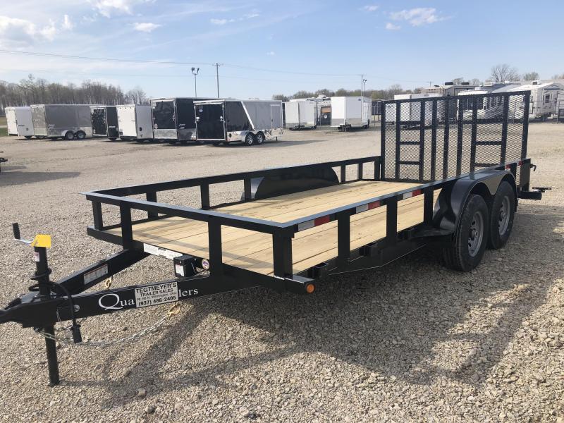 The 7x16 Quality Trailer Tandem Axle Wood floor utility trailer has treated wood floor, Heavy Duty rear gate, Dove tail, and Silver Mod Wheels with ST225/75 R15 8 ply Radial tires. The trailer as 10,000 GVW and is black in color.
