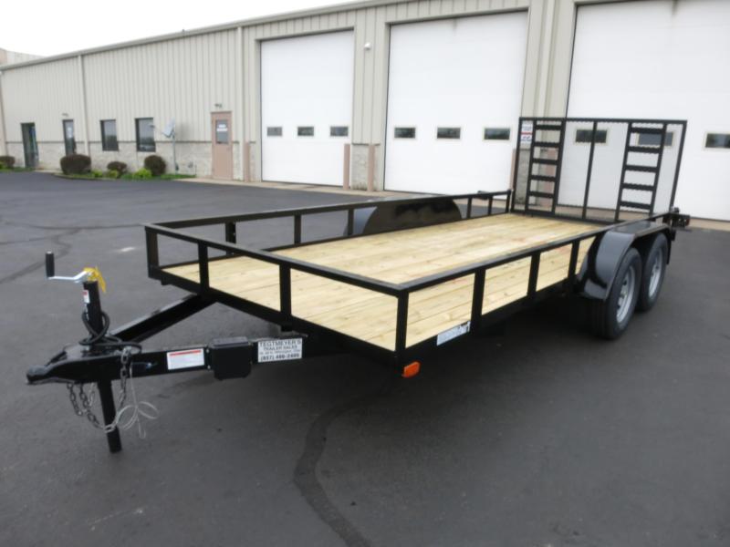 The 6x16 American Manufacturing Tandem Axle Wood Floor Utility Trailer has treated wood floor, 1 brake, and rear gate with ramps in the gate. The trailer as 7,000 GVW and is black in color.