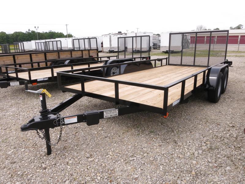 The 7x16 American Manufacturing Tandem Axle Wood Floor Utility Trailer has treated wood floor, 1 brake, extra wide, and rear gate. The trailer as 7,000 GVW and is black in color.