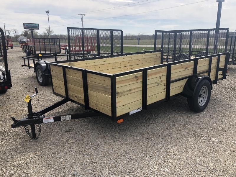 The 6x12 American Manufacturing Single Wood Floor Utlity Trailer has treated wood floor, high wood sides, and pinless rear gate. The trailer as 2,990 GVW and is black in color.