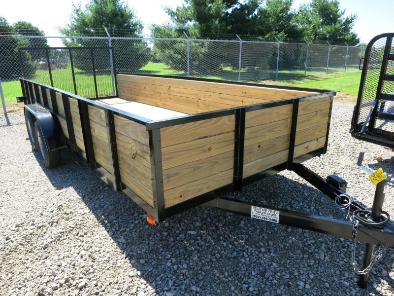 The 7x18 American Manufacturing Tandem Axle Wood Floor Utlity Trailer has treated wood floor, high wooden sides and rear pinless gate. The trailer as 7,000 GVW and is black in color.