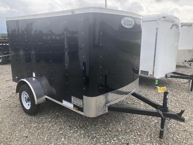 The Continental Cargo 5X8 single axle enclosed trailer is black in color with single rear door. The GVW is 2,990 lbs.